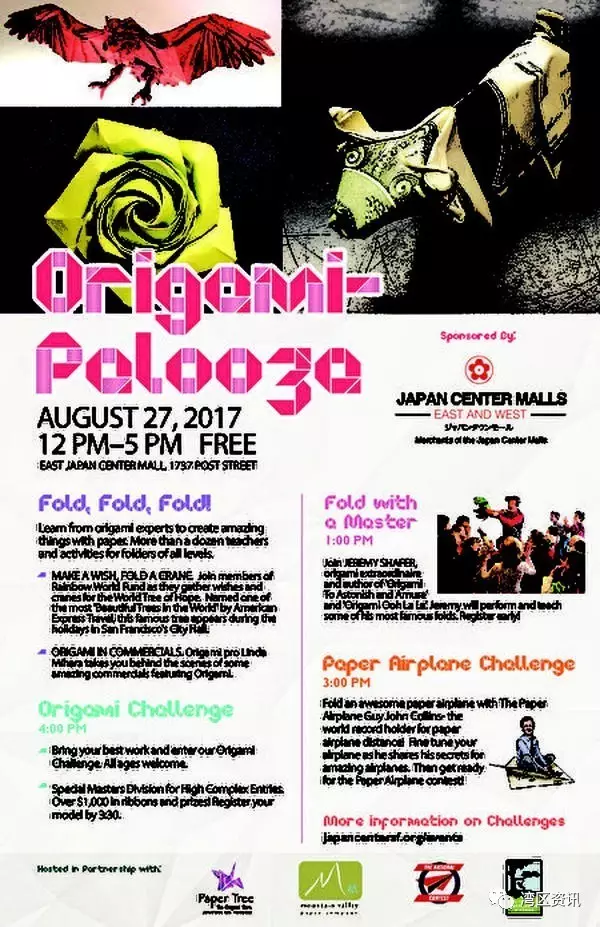 还记得自己小时候叠的纸飞机、千纸鹤还有纸小船吗?跟孩子们一起折纸是一个非常不错的活动。这个周末日本城折纸活动现场,将有超过十个折纸大师带领大家一起折出各种作品。活动面对全年龄段,除了折纸教学,还有两场折纸大赛,一场是纸飞机大赛,现场还有纸飞机飞行距离世界纪录保持人John Collins,教大家如何让纸飞机飞得更远。另一场比赛则是创作比赛,有机会获得高达1千美元奖金和礼品。