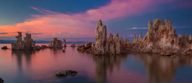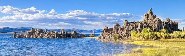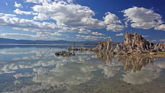 这个古老的盐湖覆盖70平方英里。湖泊本身太咸,不能维持鱼类生命,但支持一群盐水虾生存。莫诺湖最出名的景点是南岸的石灰岩塔(tufa),富含钙质的地下涌泉碰到富含碳酸盐的湖水,在海底产生化学反应,形成碳酸钙也就是石灰岩。60年前,湖水水位下降,石灰岩就露出水面。