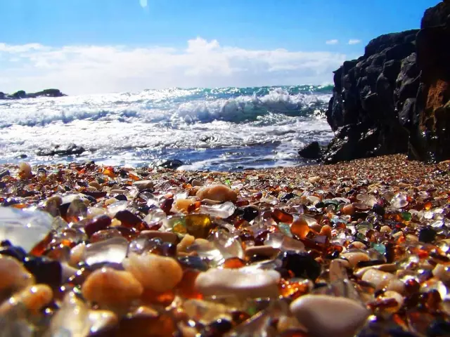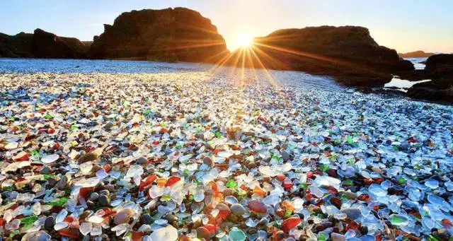 玻璃沙滩不大,但被誉为“世界上最闪亮的沙滩”,这里的沙滩是由五颜六色的玻璃石组成,每一颗都圆润剔透,在阳光的照射下色彩斑斓,如果在航拍的镜头下,会是一条被五彩的玻璃点亮的蜿蜒的海岸线。