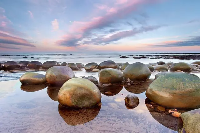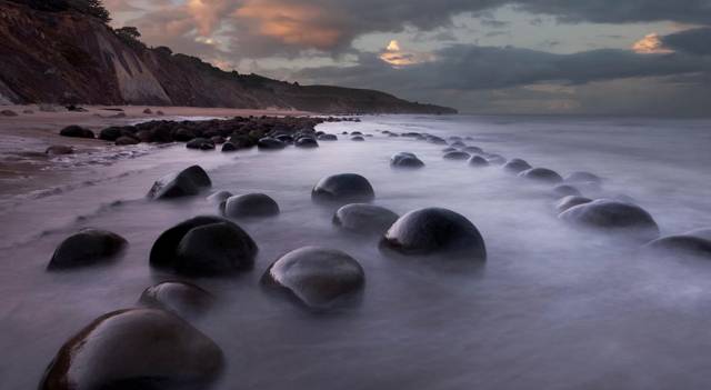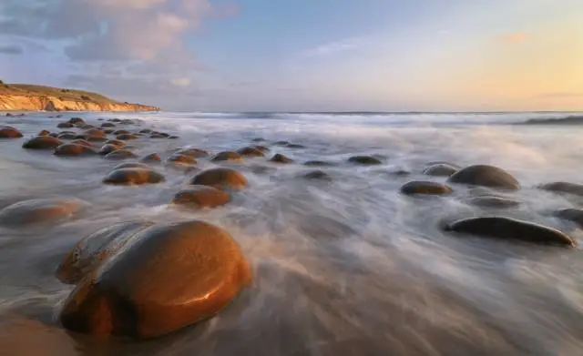 保龄球沙滩是因长年来地质沉积将硬度不同的物质挤压成岩石,经过海水多年的冲刷和打磨,质地比较坚硬的部分留在了沙滩上,颗颗光滑圆润。