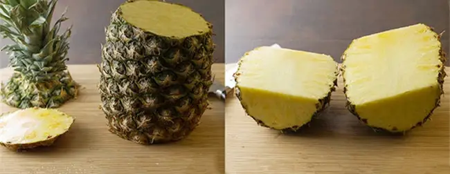 菠萝去头去尾,立在砧板上,然后打竖对半切开