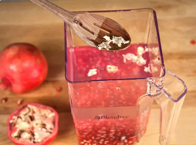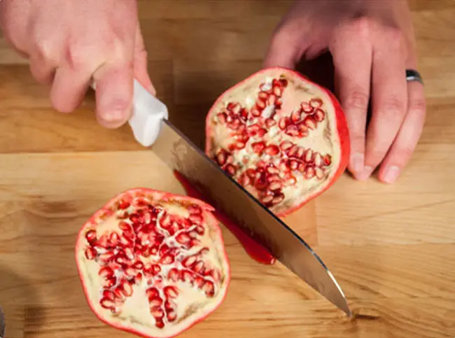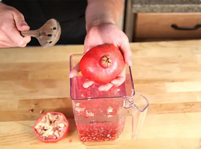 一手拿着切开的半个石榴,橫切面朝著裝了水的容器